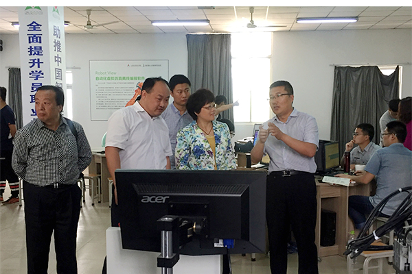 在山东铝业职业学院工业机器人实训室,该院培训管理处负责同志介绍了工业机器人实训室建设的理念和管理现状,展示了基于工业4.0的工件封装与生产工艺相结合的多品牌机器人实训室运行状况。随后,该院专业教师对课程建设以及学做一体的教学模式进行了介绍。