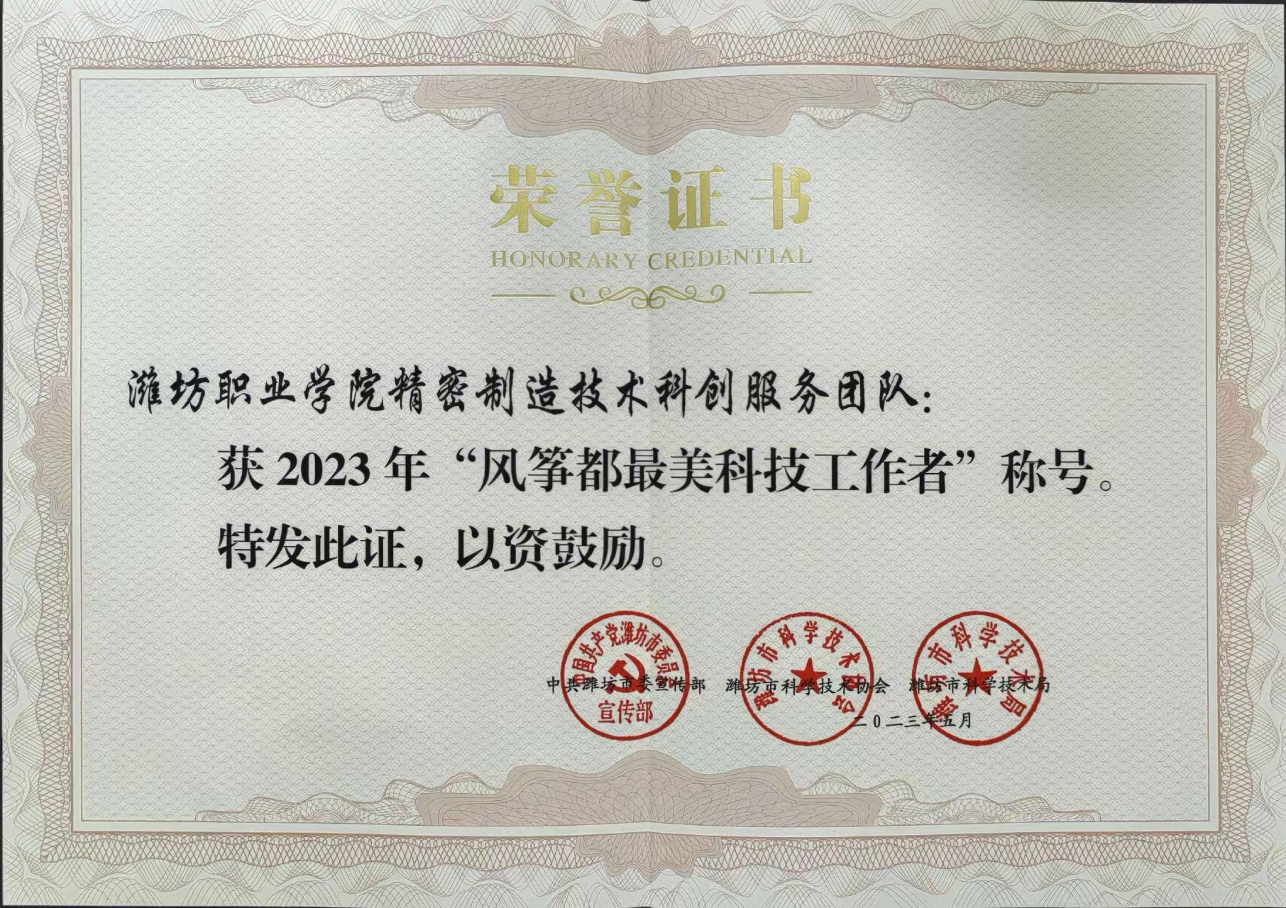 精密制造技术科创服务团队是国家“双高”专业群核心建设团队,拥有中国机电职业教育名师、省青年技能名师等。建有山东省高等学校优质协同创新中心等省级平台6个,协助企业立项省、市级重点科研项目8项,帮助企业解决技术难题23项,提高经济效益2000余万元。截至目前,团队承担市厅级以上项目30余项,授权发明专利15项,发表SCI等高水平论文12篇,获山东省机械工业科技进步奖、潍坊市科技进步奖等25项。指导学生荣获“互联网+”“挑战杯”等国家一类双创赛事3金3银5铜,获省级奖励300余项,培养了获中国大学生自强之星等省级荣誉称号以上30人次。