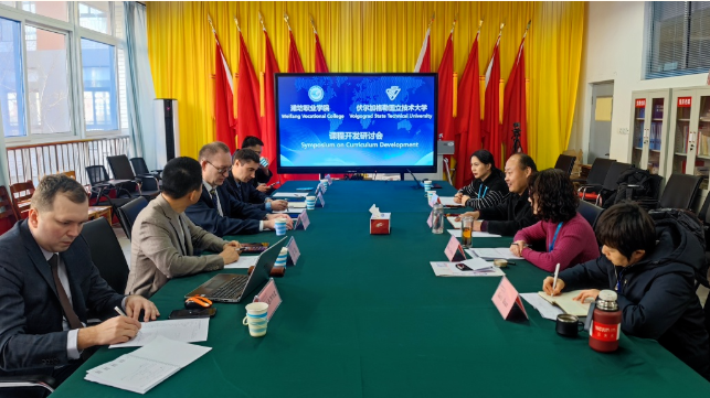韩瑞东对客人的来访表示热烈欢迎,共同观看了学院宣传片,介绍了学院办学历史、发展现状及取得的主要成绩,肯定了合作办学项目进展现状,希望通过双方努力,推动项目规范化、高质量发展,也希望两校未来有更广阔的合作前景。博约科对学院的热情接待表示感谢,简要介绍了伏尔加格勒国立技术大学所在城市历史、学校办学基本情况等。随后,双方代表召开项目联合管理委员会会议,就课程设置、师资交流、授课模式、学生专升本衔接等共同关心的问题进行了深入探讨。