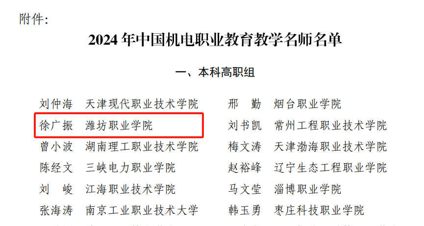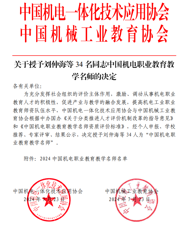 7月23日,中国机电一体化技术应用协会和中国机械工业教育协会联合公布了中国机电职业教育教学名师资质授予决定,我院永利y23455徐广振入选,至此,我院已累计3名教师获此殊荣。