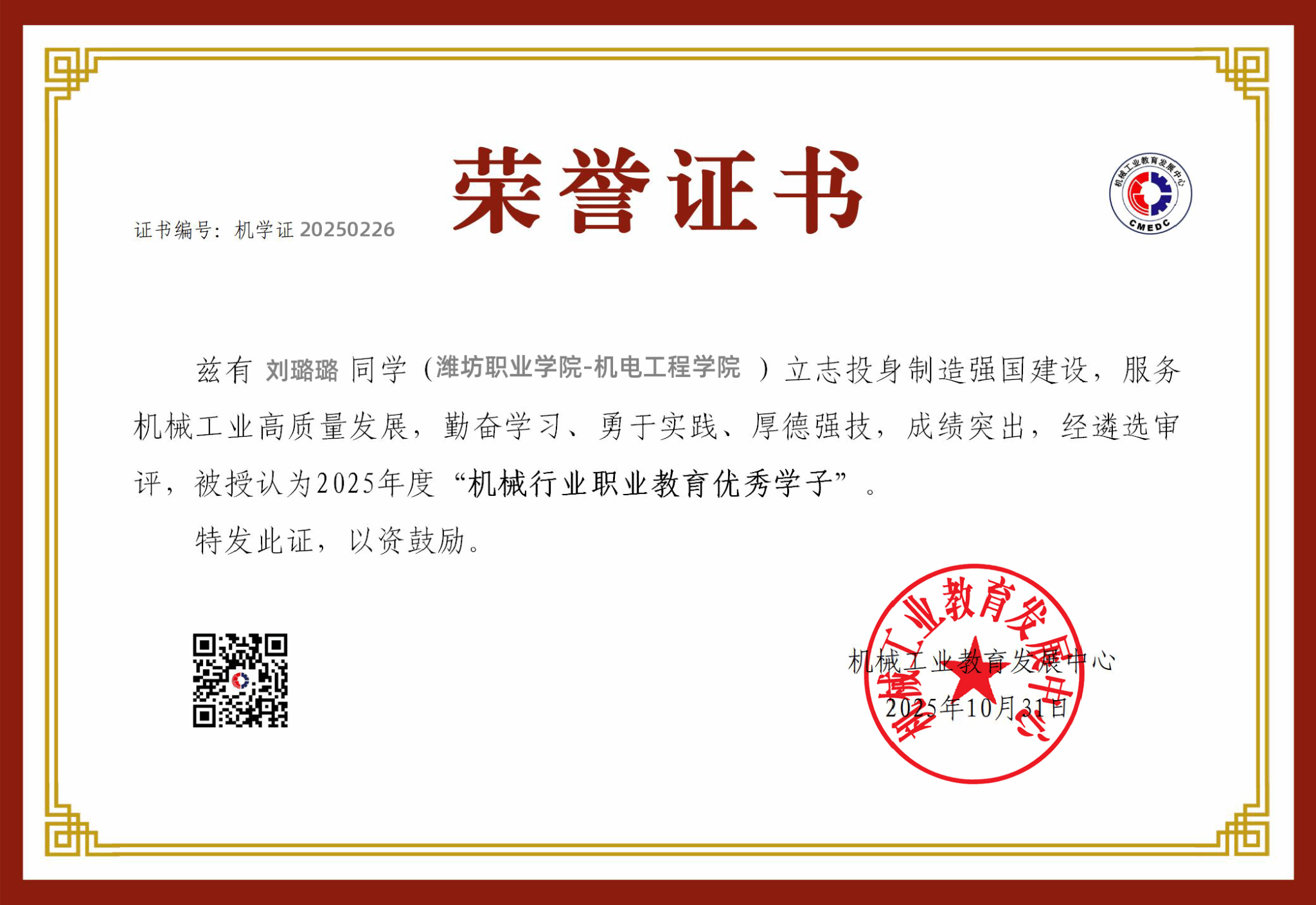 近日,首届“机械行业职业院校优秀学子”遴选认定工作结果正式揭晓。经院校推荐、专家评审及公示程序,全国共496名2025届毕业生获此殊荣。我院永利y23455刘璐璐、崔晓阳,汽车工程学院高峰、潘洪俊四位同学凭借优异的综合素质和突出的专业技能成功入选。
