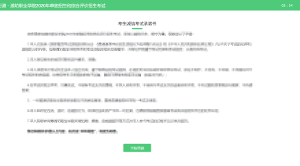 (1)考试开始后,系统将自动跳转至考生承诺书页面,请考生认真阅读确认无误后,点击“开始答题”按钮,进入考试界面。