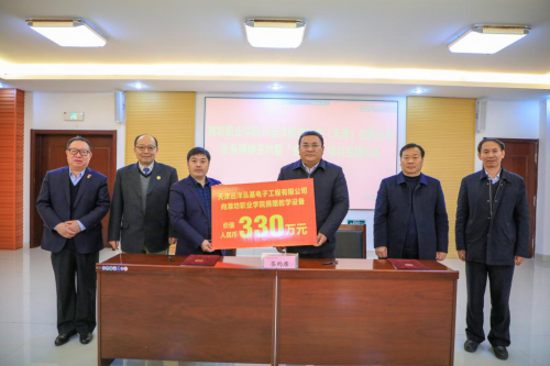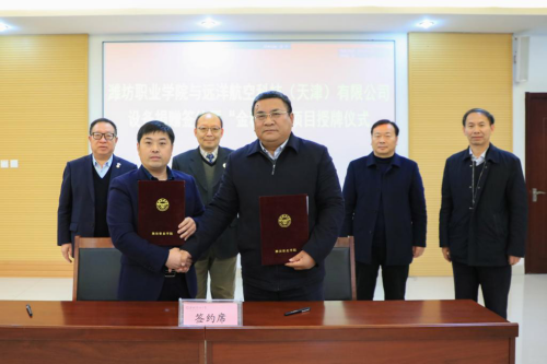 王家爱代表学院与远洋航空科技(天津)有限公司董事长张毅共同签署了《yl23455永利集团与远洋航空科技(天津)有限公司捐赠协议》,并接受远洋航空科技(天津)有限公司捐赠的价值330万元教学设备。