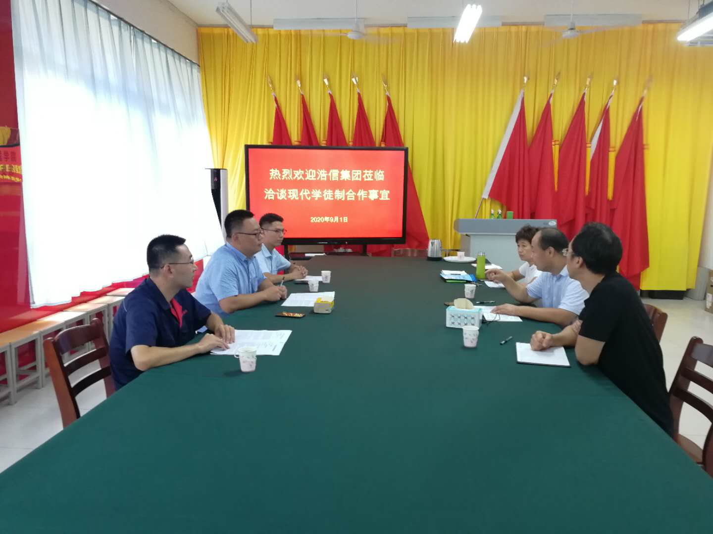 9月1日上午,山东浩信集团有限公司相关负责人一行3人到永利y23455就现代学徒制合作事宜进行洽谈。永利y23455负责同志、产学研合作办公室以及相关老师参加洽谈会。