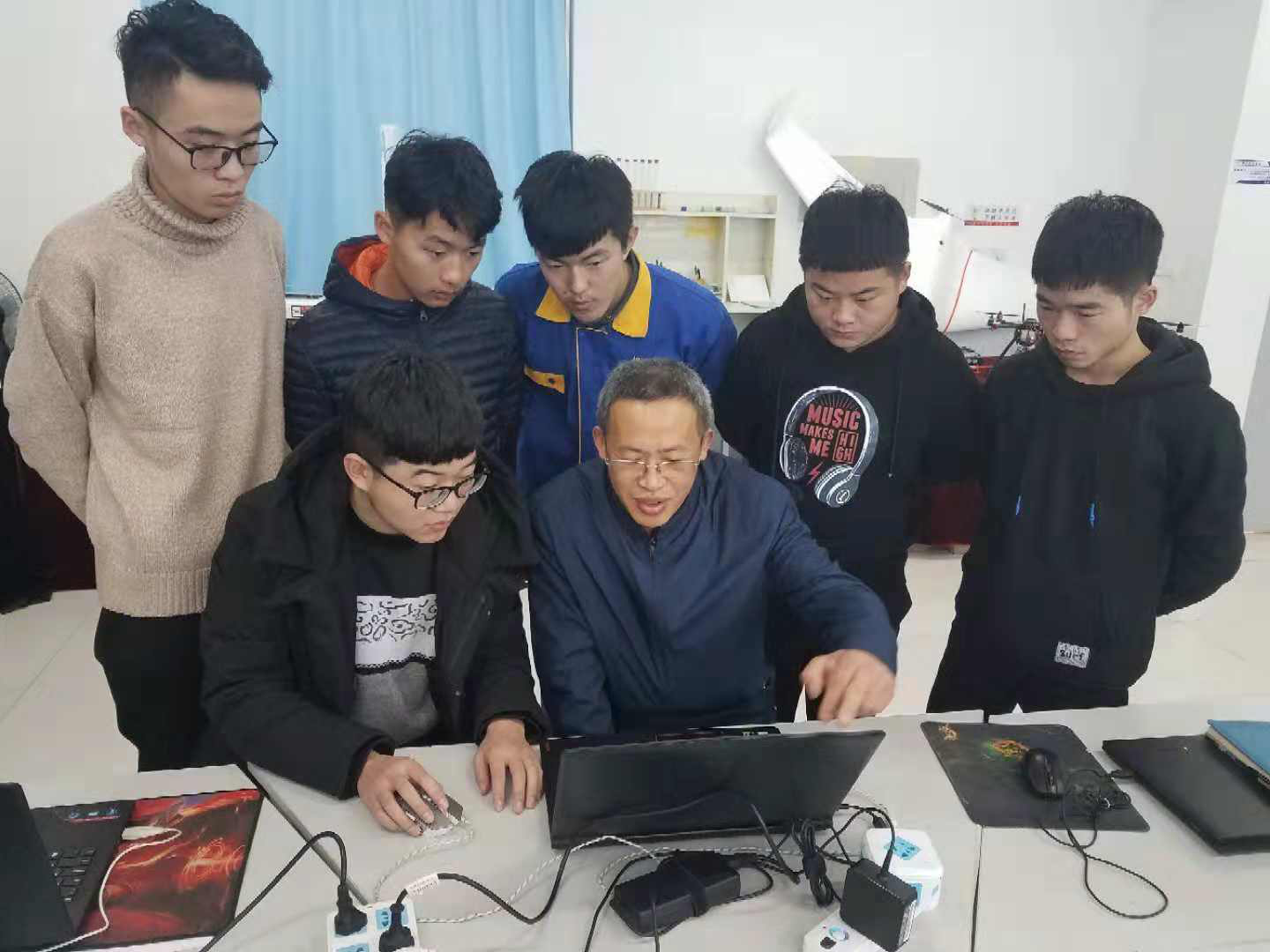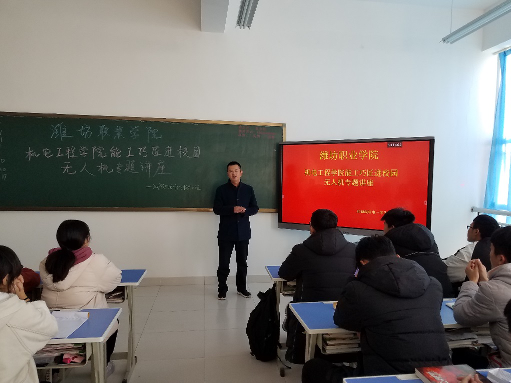 锐翔航空科技有限公司袁光刚总经理为我院2018级机电一体化技术专业(无人机方向)60名同学进行了一场别开生面的无人机应用技术讲座。袁光刚用视频和实物展示的方式从无人机种类、应用场景、市场潜力、人才需求、技能掌握等方面对无人机知识进行了生动的讲解,对于正处于通识课程学习阶段的大一新生来说,袁总的讲座让在场的学生对无人机专业学习产生了浓厚的兴趣,对行业、企业、人才需求现状也有了更深的了解,对于今后的专业学习及职业生涯规划大有裨益。