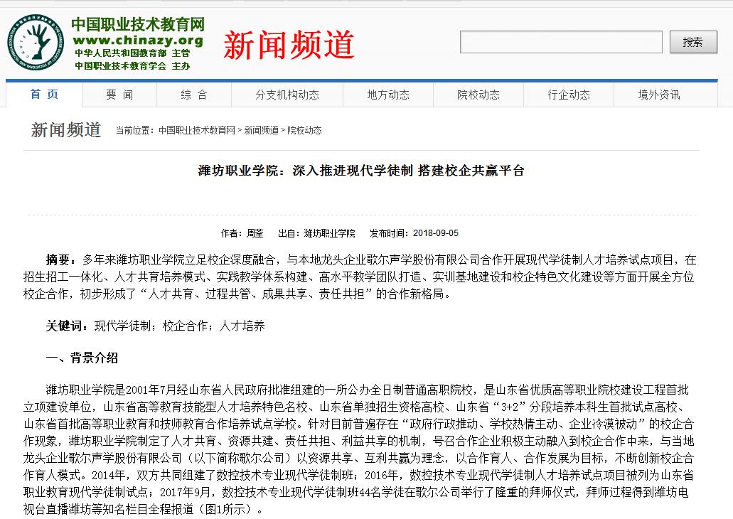 以山东省职业教育现代学徒制试点为契机,由我院与知名企业歌尔股份有限公司合作组建的数控技术专业现代学徒制试点班自2017年成立以来,在校企双方的共同努力下平稳有序推进,得到社会各界的广泛关注。