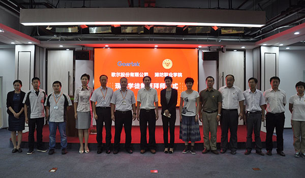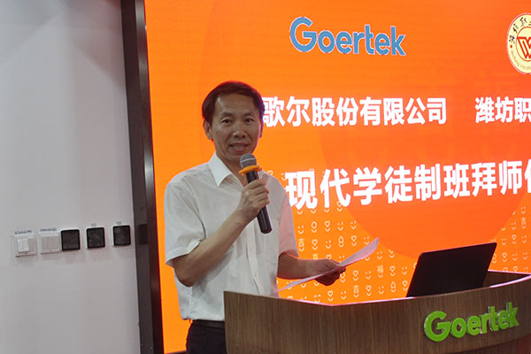 李瑞昌在讲话中说,现代学徒制是我院与歌尔股份有限公司合作的一件大事,是校企双方共同探索校企协同育人机制、共同培养高素质技能人才、实现学校、企业、学生三方共赢的重要举措。希望学徒能秉承我院“明德尚学、强能善技”的校训,尊师重道,把握住这次学习的机会;各位师傅承担起相应的责任,在指导中“倾真情、传真经”,师徒之间相互促进,形成互学共进、敬业奉献、比学赶超的良好氛围。